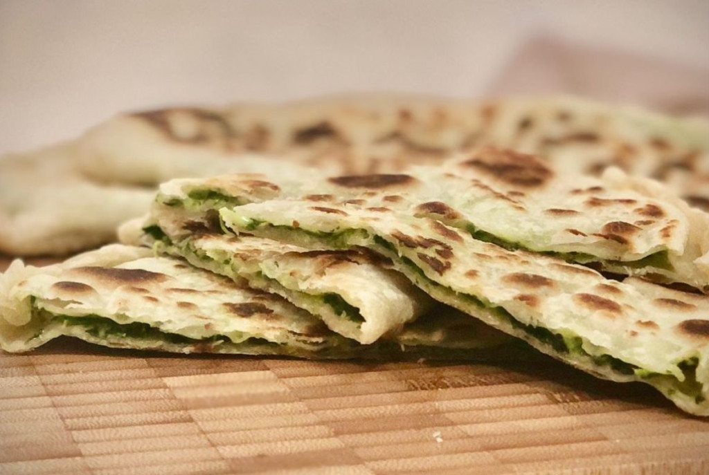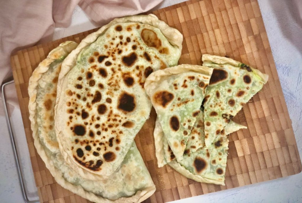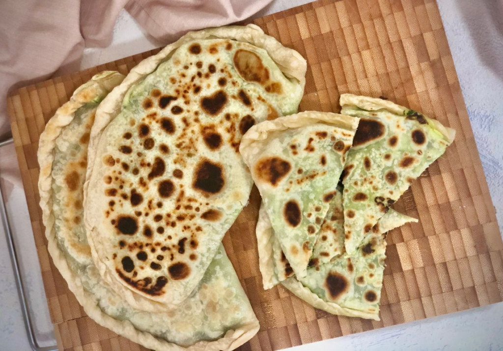 Divide the dough into three equal parts. Roll each piece into a circle, about the size of a crepe. Coat half of the circle with the filling, fold, close tightly and bake it in an oiled pan over a low heat (or a light fire). While baking, keep it covered. Bake for a few minutes on each side, and before turning, coat the top with oil, preferably olive oil.
