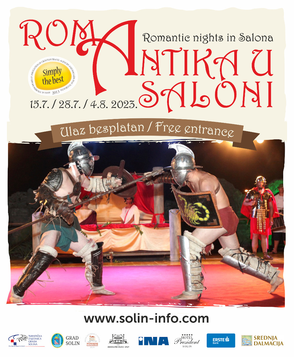 Tako će i ovoga puta u romantičnoj Saloni tri ljetne večeri biti prilika za bijeg u antičko doba. Tih ćete večeri i na ulicama Solina susretati gladijatore, cara Dioklecijana i caricu Prisku, antičke zabavljače i obrtnike, jer će grad postati kulisom za prikaz života u vrijeme antike. Organizatori su se pobrinuli za pravi doživljaj i povratak u daleku prošlost najvećega hrvatskog arheološkog parka, pa ćete prve dvije tematske večeri moći razgledavati Salonu besplatno uz pratnju lokalnog vodiča. No, osim samog lokaliteta Salone ima se u Solinu za vidjeti još interesantnih sadržaja kao što su Manastirine (starokršćansko groblje), Tusculum (Arheološki muzej s replikama starih predmeta) i amfiteatar iz 2. stoljeća, katedralni kompleks s dvije bazilike, krstionicom i termama, te Gašpina mlinica na rijeci Jadro gdje i danas možete vidjeti kako se melje žito, baš kao što se to radilo u stara vremena. Šetnjom uz rijeku stići ćete i do Gospinog otoka s najstarijim marijanskim svetištem u Hrvatskoj i novom bazilikom Svete Obitelji.